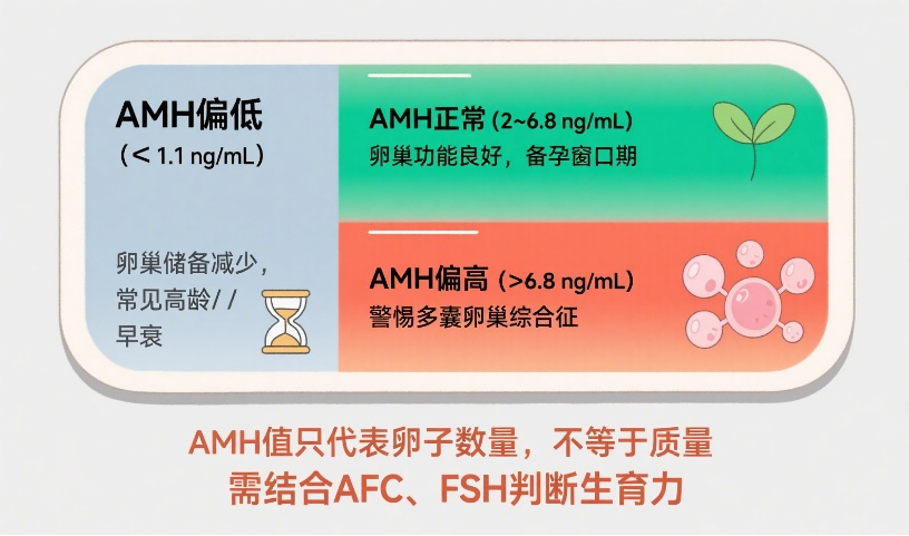 值得注意的是,AMH低并不等于不能怀孕,AMH低仅提示卵子数量少,但仍可能自然怀孕。反之亦然,AMH高也不等于易怀孕,多囊卵巢综合征患者其AMH高,但可能因排卵障碍难孕。并且AMH仅反映卵泡数量,不代表卵子质量,高龄女性即使AMH正常,生育力仍可能下降。生育力受年龄、卵子质量等多因素影响,AMH只是参考依据之一,需根据临床表现综合判断。