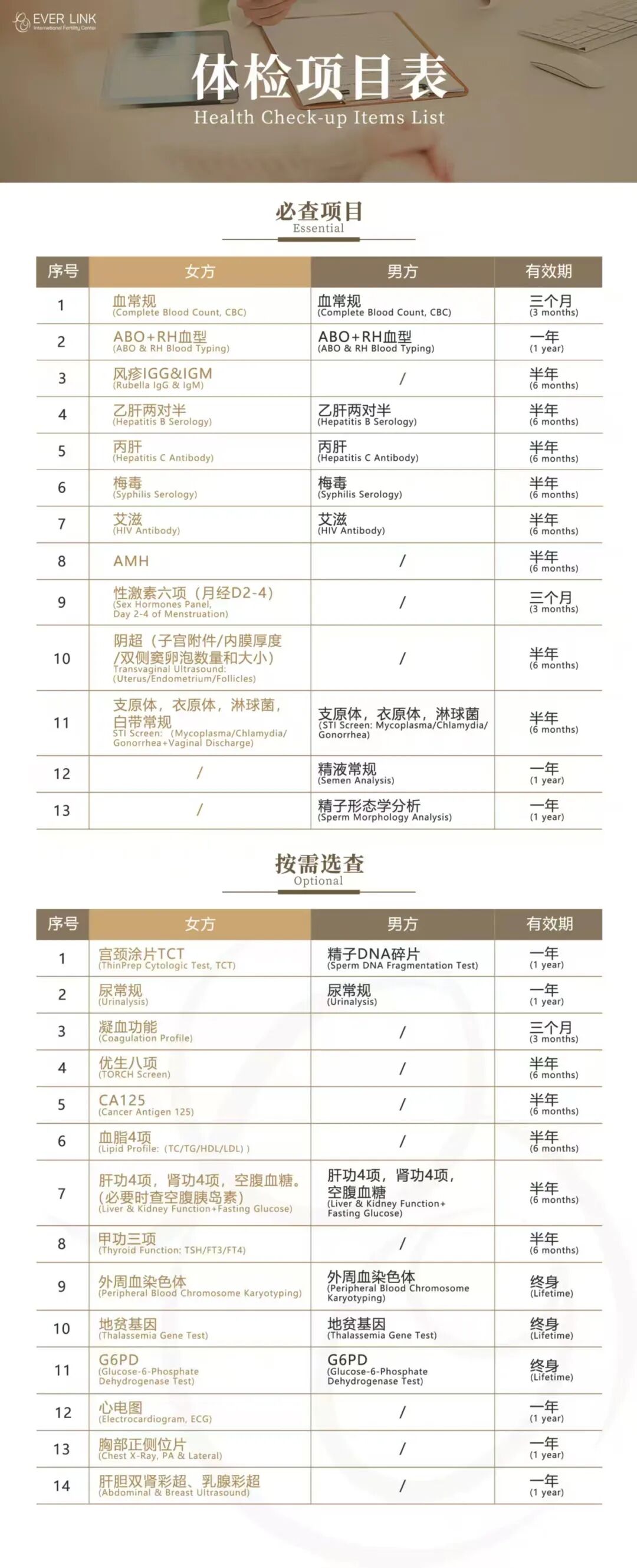 而男方的检查内容则包括了血常规、血型、乙肝、丙肝、衣原体、淋球菌和精液常规分析等。